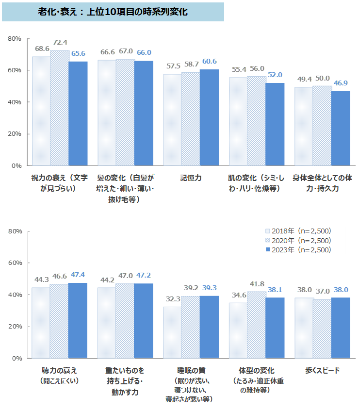 老化や衰えを自覚していることは、「視力の衰え(文字が見づらい)」が最も高く7割弱。次いで「髪の変化(白髪が増えた・細い・薄い・抜け毛等)」が7割弱、「記憶力」「肌の変化(シミ・しわ・ハリ・乾燥等)」が5割台で、上位にあがる。