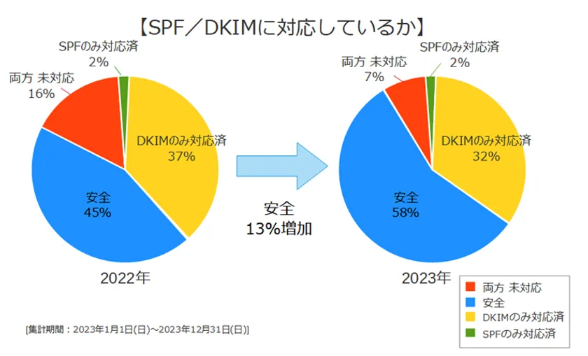 ・「安全(SPF(※1)/DKIM(※2)両方の実装と認証の合格)」の割合が2022年より13%増加