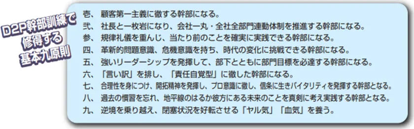 この重要な意識改革の課題を解決していくために開発されたプログラムがD2P幹部訓練である。