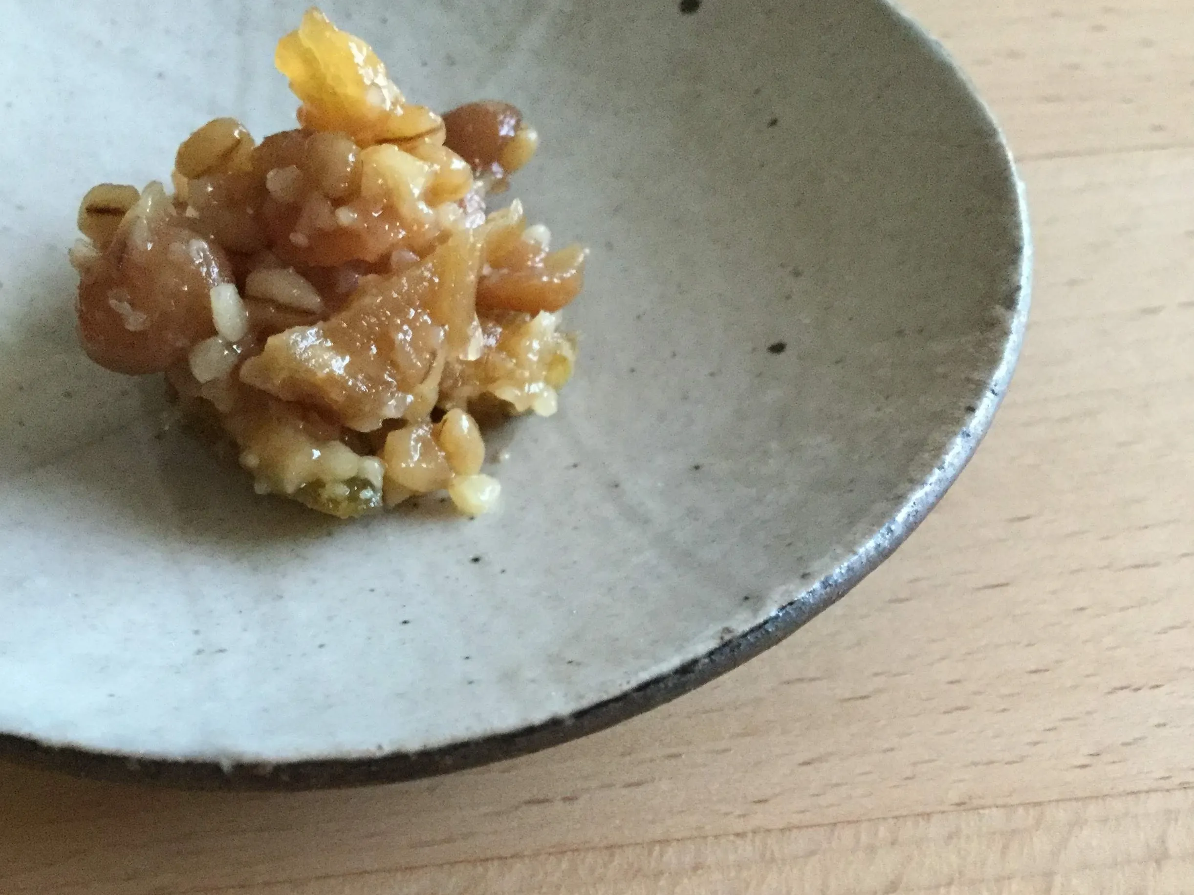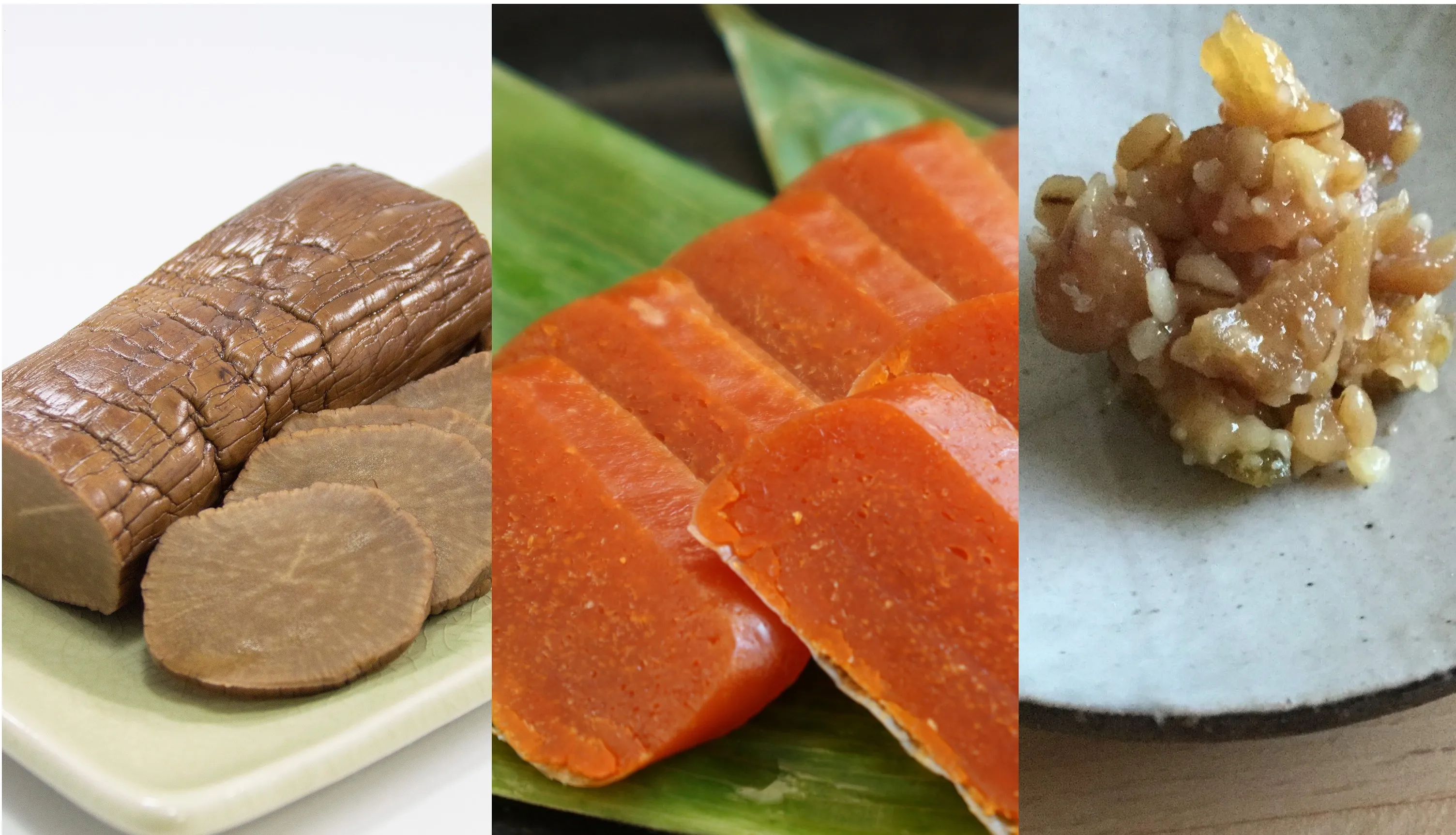 ボラの卵を塩漬けにしたあと、塩抜きし、干して乳酸発酵させたものです。ちびちびかじりながら日本酒を流し込むと、強い塩気とうま味がお酒を引き立てます。