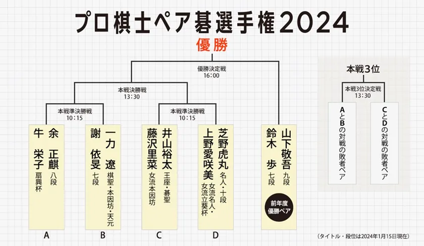 ※前年度優勝ペアの鈴木歩七段・山下敬吾九段ペア以外のペアの組み合わせと本戦準決勝戦の対戦組み合わせは、昨年12月20日に日本棋院東京本院で実施した抽選会で決定しています。