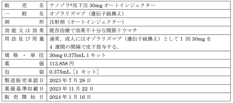 大正製薬株式会社[本社:東京都豊島区 社長:上原 茂](以下、当社)は、TNFα阻害薬「ナノゾラ®皮下注30mgオートインジェクター(一般名:オゾラリズマブ(遺伝子組換え))」が2023年11月22日に薬価基準に収載され、本日発売いたしましたのでお知らせいたします。