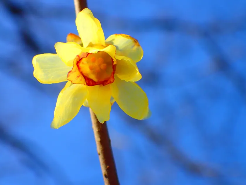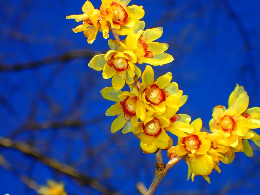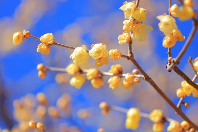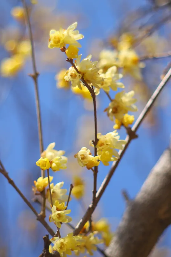 ロウバイは、クスノキ目ロウバイ科ロウバイ属に属する中国原産の落葉樹で、名前の由来は、「花がロウ細工のように美しいから」や「臘月(旧暦の12月)に咲くから」などと言われています。ロウ細工のようなつやのある小さい黄色い花で、英語では「Wintersweet(ウィンター・スウィート)」という名のとおり甘く濃厚な香りが特徴です。