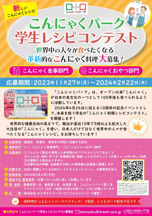 日本の伝統食“こんにゃく”を楽しく体感する施設「こんにゃくパーク」(代表取締役社長:横尾 浩之、運営:株式会社ヨコオデイリーフーズ)は、2023年11月27日(月)より開催している『こんにゃくパーク学生レシピコンテスト』への応募受付が120件(2024年1月15日現在)となり、全国の調理、栄養、食物系の学校に在籍する学生から数多くの応募が寄せられています。一部料理は2024年4月26日(金)に10周年を迎えるこんにゃくパークの無料バイキングで提供する予定です。