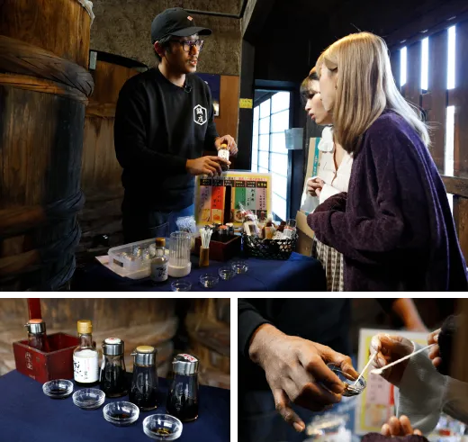 体験では150余年の歴史を刻み、麹菌が棲みつく醤油蔵をご紹介。その蔵のなかで、こいくち醤油3種類とうすくち醤油の全4種類を味比べ。