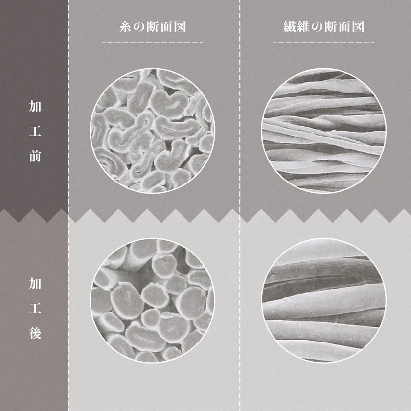 今回使用した生地には、綿などのセルロース系繊維を改質する加工、「液体アンモニア加工」を施しました。