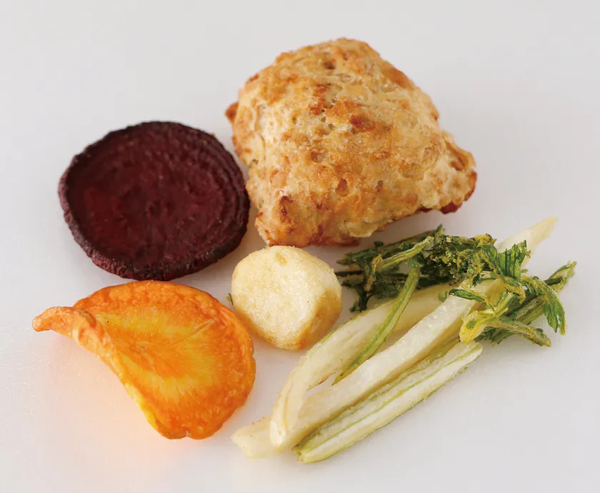 ニンニク、セロリ、にんじんといった吸血野菜たちに加え、色鮮やかなビーツがスープの色を徐々に血のような赤色にします。大豆ミート唐揚げはロナルドの好物である「唐揚げ」をイメージ。真空フライヤー加工によって素材それぞれの風味をそのまま凝縮した具材に仕上げました。