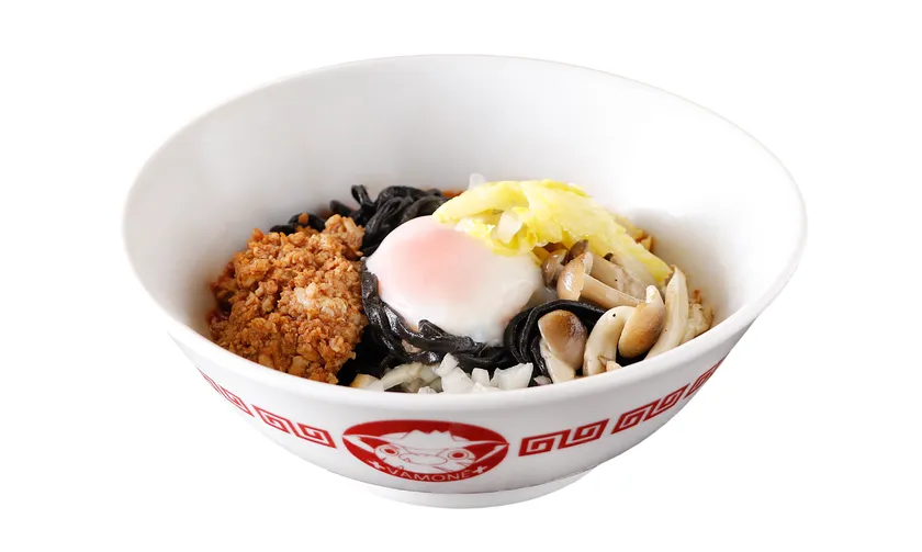 黒いイカ墨麺と赤い鶏ひき肉と温泉玉子でロナルド・ドラルク・ジョンをイメージ。麺の下にあるトマトベースの醤油ダレとよく混ぜてお召し上がりください。