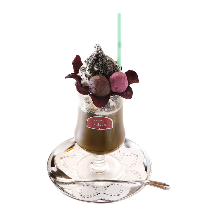 すっきりほろ苦で大人な味わいのほうじ茶フロートです。トッピングの黒すりゴマやあんこ玉はドラルクの“あの”シーンをイメージ。