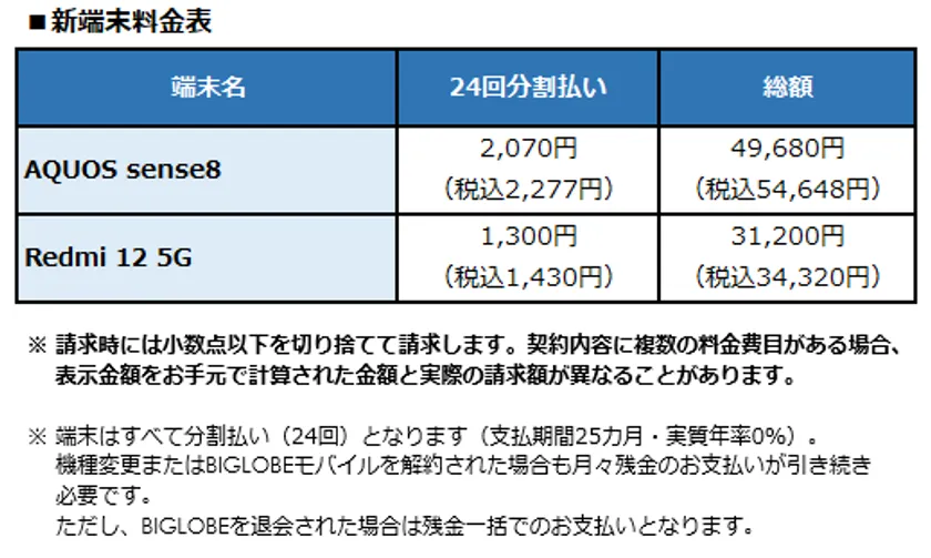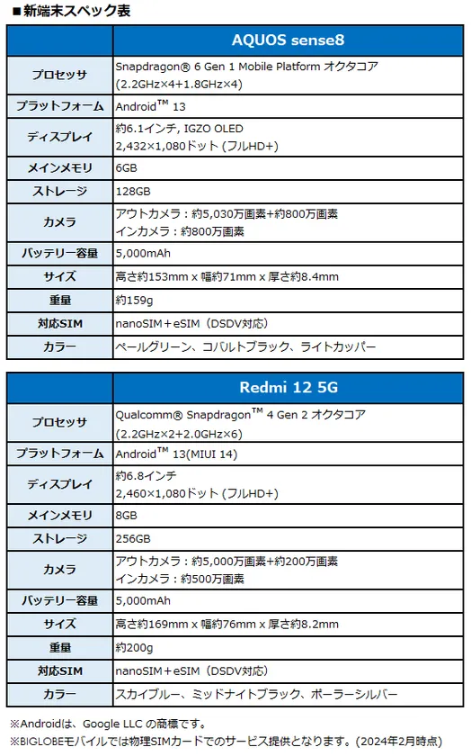 ビッグローブ株式会社(本社:東京都品川区、代表取締役社長:山田 靖久、以下 BIGLOBE)は、モバイルサービス「BIGLOBEモバイル」において、シャープ製スマートフォン「AQUOS sense8」とXiaomi製スマートフォン「Redmi 12 5G」の提供を2月1日より開始します(注1)。