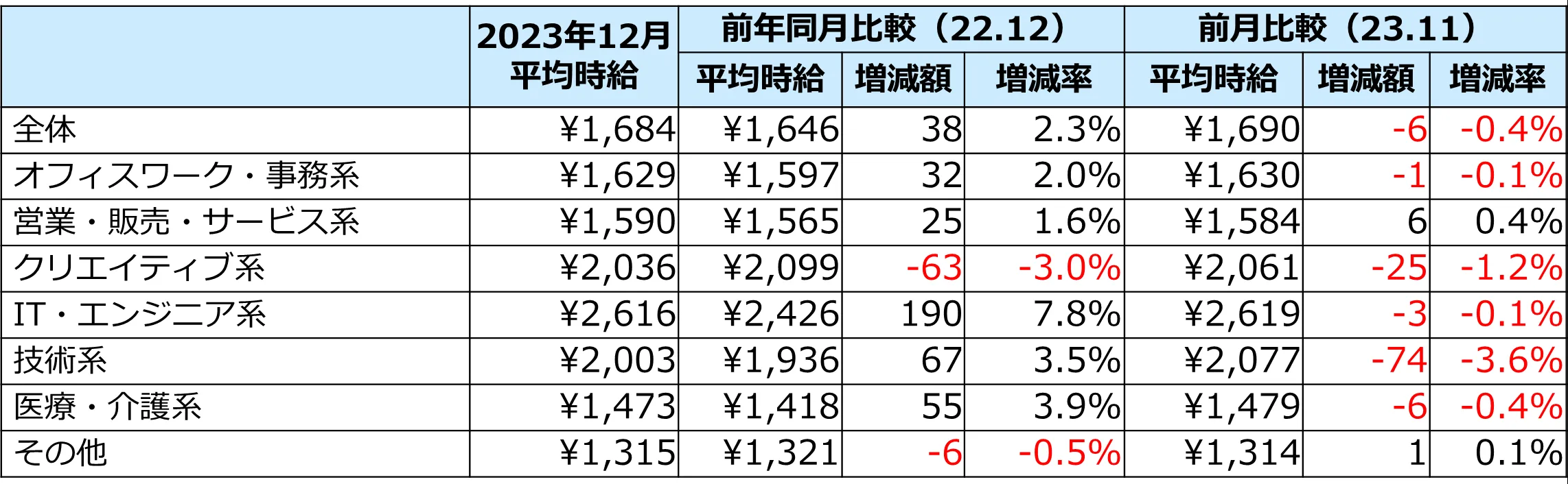 2023年12月度の三大都市圏平均時給は1,684円(前月比-6円・0.4%減、前年同月比+38円・2.3%増)で、過去10年間で第2位の高時給となりました。前年同月比を上回るのは16か月連続です。職種別では、全7職種のうち5職種(オフィスワーク系、営業・販売・サービス系、IT・エンジニア系、技術系、医療・介護系)で時給が上昇しました。