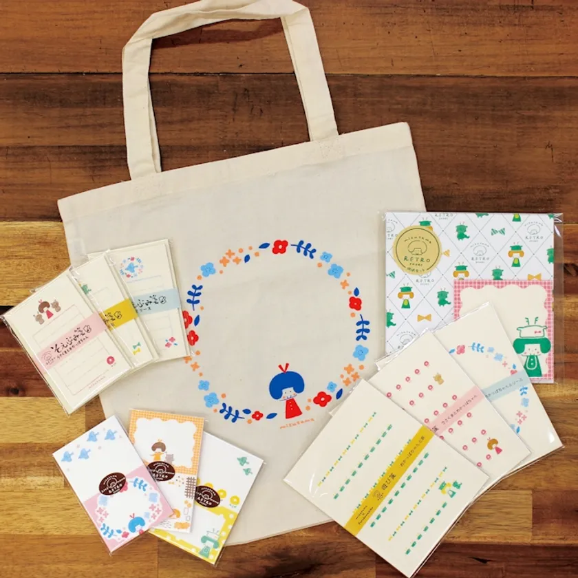 人気イラストレーターのmizutamaさんが描き下ろしたイラストと、古川紙工のレトロなデザインがコラボした、そえぶみ箋、遊び箋、ニコイチmemoに加えて、柄紙とメモがセットになった『柄紙セット』、今回発売される商品をすべてセットにした、トートバッグ付きの『コンプリートセット』がラインナップ。