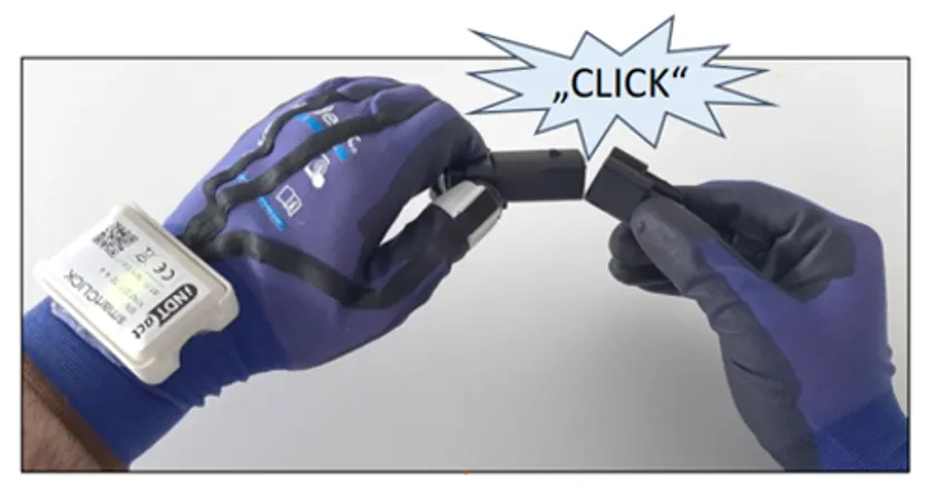 各作業者のグローブの外側(または内側)に検知センサを、またBluetoothを備えたモジュールを手首に装着し、組付け時の嵌合音を受信機に送ることで、コネクタの組付けOK/NOK判定をいたします。