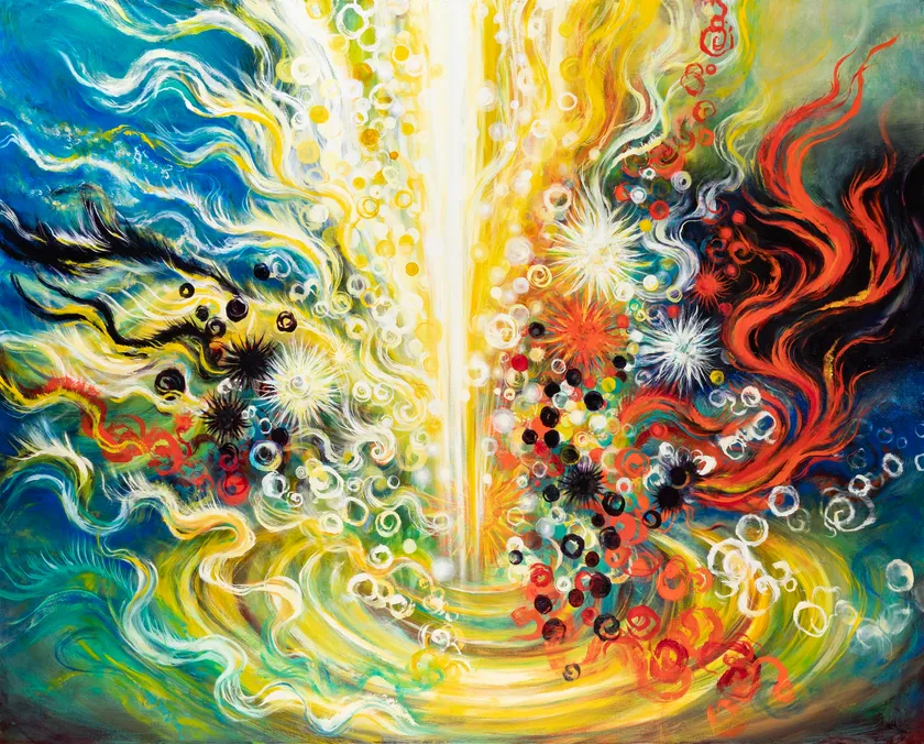 最新作「夢」は初めて黒をひとつの色として表現しました。すべての色、光と闇がともにある世界のイメージです。コロナの日々に生まれた「光明の種」は、命の輝き、命の故郷を描きました。
