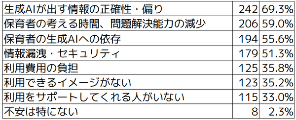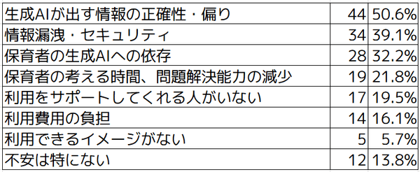 生成AIを利用している方がもっとも不安に感じているのは「生成AIが出す情報の正確性・偏り」で50.6%という結果でした。次いで「情報漏洩・セキュリティ」が39.1%、「保育者の生成AIへの依存」が32.2%があげられました。