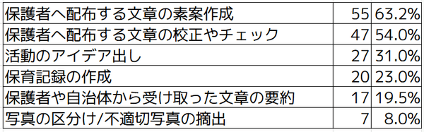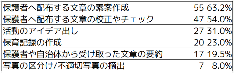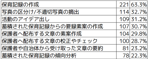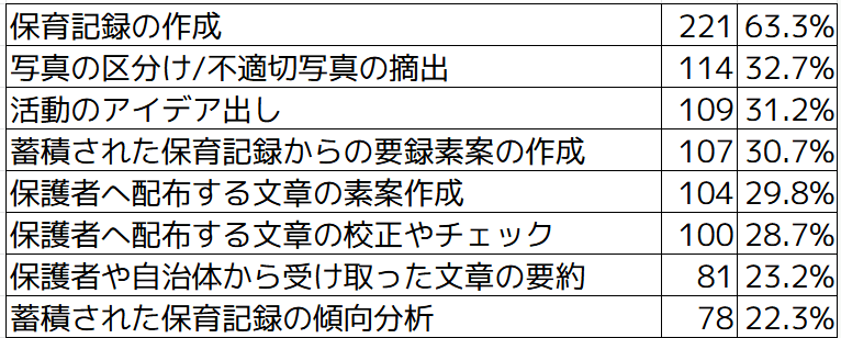 「保育記録の作成」が63.3%ともっとも多く、次いで「写真の区分け/不適切写真の摘出」が32.7%という結果となりました。その他としては「抵抗はないがイメージがわかない」や「指導案や保育計画の作成」などがあげられました。
