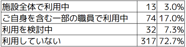 72.7%が生成AI未利用と、保育ICT利用施設においても生成AIの利用は進んでいないことがわかります。利用している場合も、一部の職員での利用が17%、施設全体での利用は3%ともっとも少ない結果となりました。