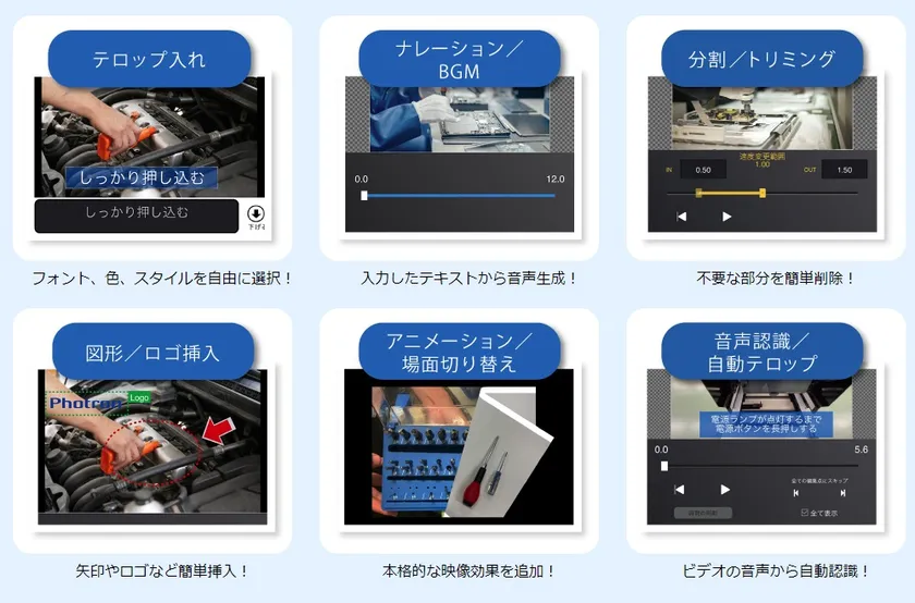 テロップ入れ、ナレーション/BGM、分割/トリミング、図形/ロゴ挿入、アニメーション/場面切り替え、音声認識/自動テロップが端末1台で可能です。