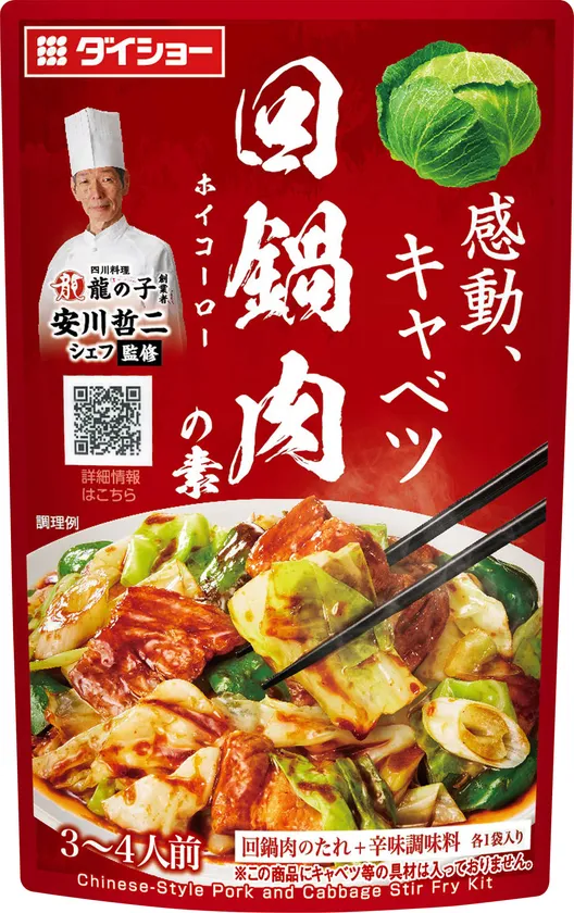 『本格中華シェフ 安川哲二監修 回鍋肉の素』は、甜麺醤・豆鼓醤のコクと甘み、にんにくの風味を効かせた「回鍋肉のたれ」と、豆板醤にローストガーリックと紹興酒の風味を加え、お好みの辛さに調節できる「辛味調味料」がセットになった、キャベツがおいしく食べられる専用調味料です。キャベツ、長ネギ、ピーマン、豚バラスライス肉と、いつもの材料なのに、中華シェフ監修の本格的な回鍋肉が手軽に楽しめます。