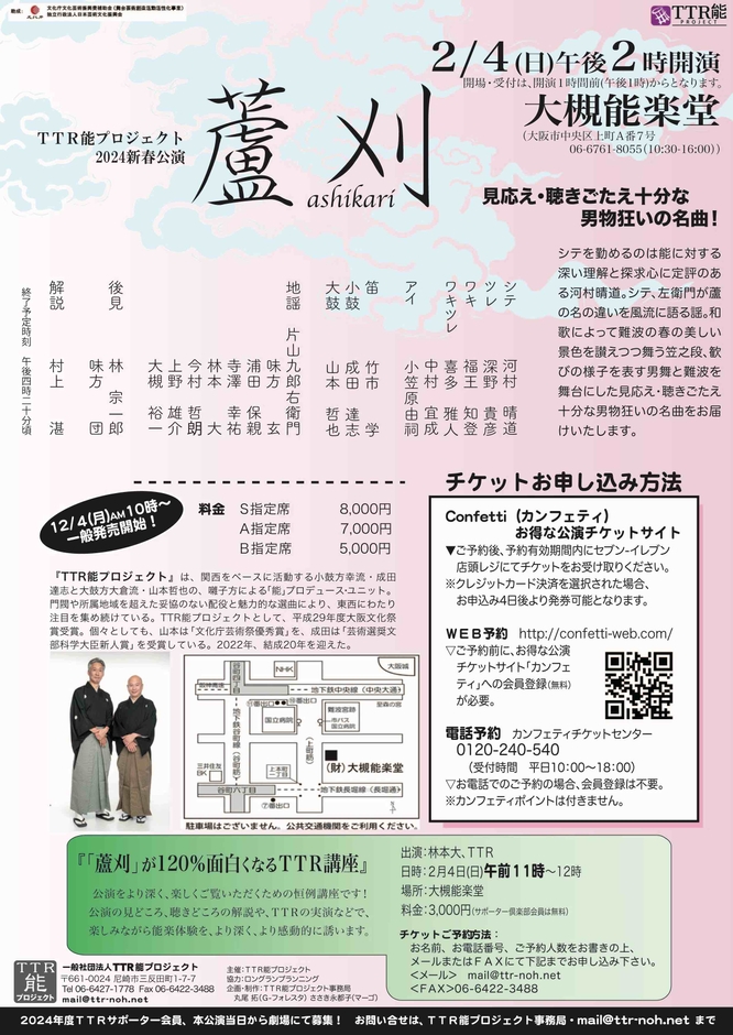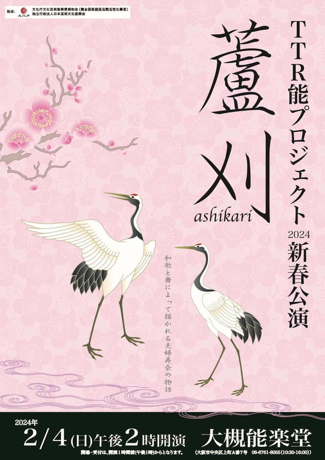 TTR能プロジェクト主催、2024新春公演『蘆刈』が2024年2月4日 (日)に大槻能楽堂(大阪府中央区上町A-7)にて上演されます。