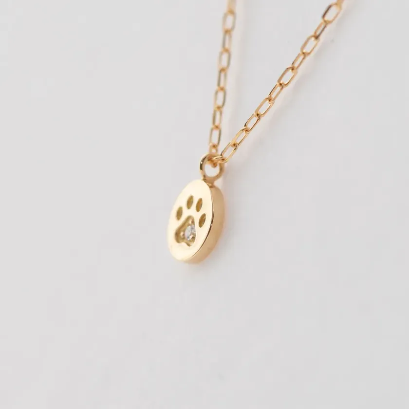 小さくて可愛らしい肉球をシンプルなコインモチーフに落とし込んだネックレスで、中央にダイヤモンドを一石あしらっています。