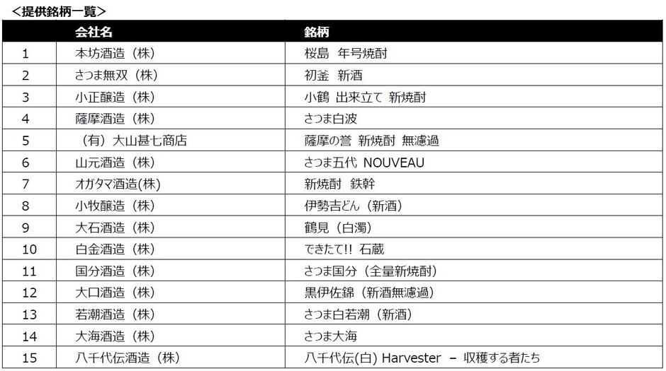 期間中は、鹿児島の薩摩酒造(株)「さつま白波」、八千代伝酒造(株)の「八千代伝(白) Harvester – 収穫する者たち」をはじめ、薩摩焼酎を中心に15銘柄の新酒が集結。1杯100円(税込)から、香り高くすっきりとした“旬”の新酒をお楽しみいただけます。