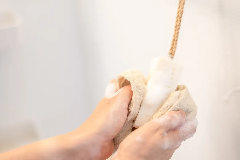 これ一つあれば、ボディソープも洗顔料も要らない優れもの。家族みんなで使えるよう、大きなサイズに。(140グラム)麻紐を石鹸の中に通してあるので、お風呂に吊るして衛生的に使えます。