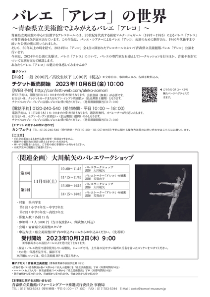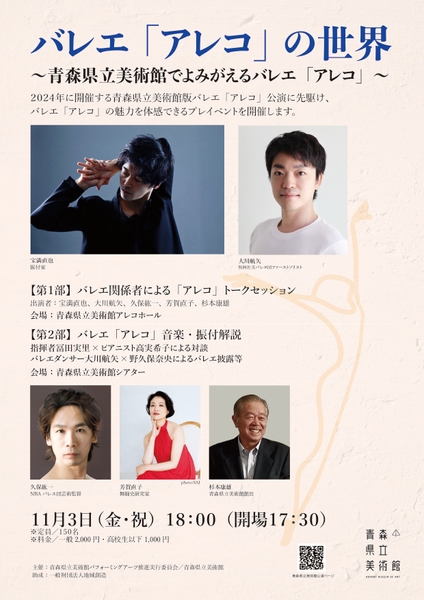 青森県立美術館パフォーミングアーツ推進実行委員会、青森県立美術館主催、『バレエ「アレコ」の世界~青森県立美術館でよみがえるバレエ「アレコ」~』が2023年11月3日 (金・祝)に青森県立美術館アレコホール及びシアター(青森県青森市安田字近野185)にて開催されます。