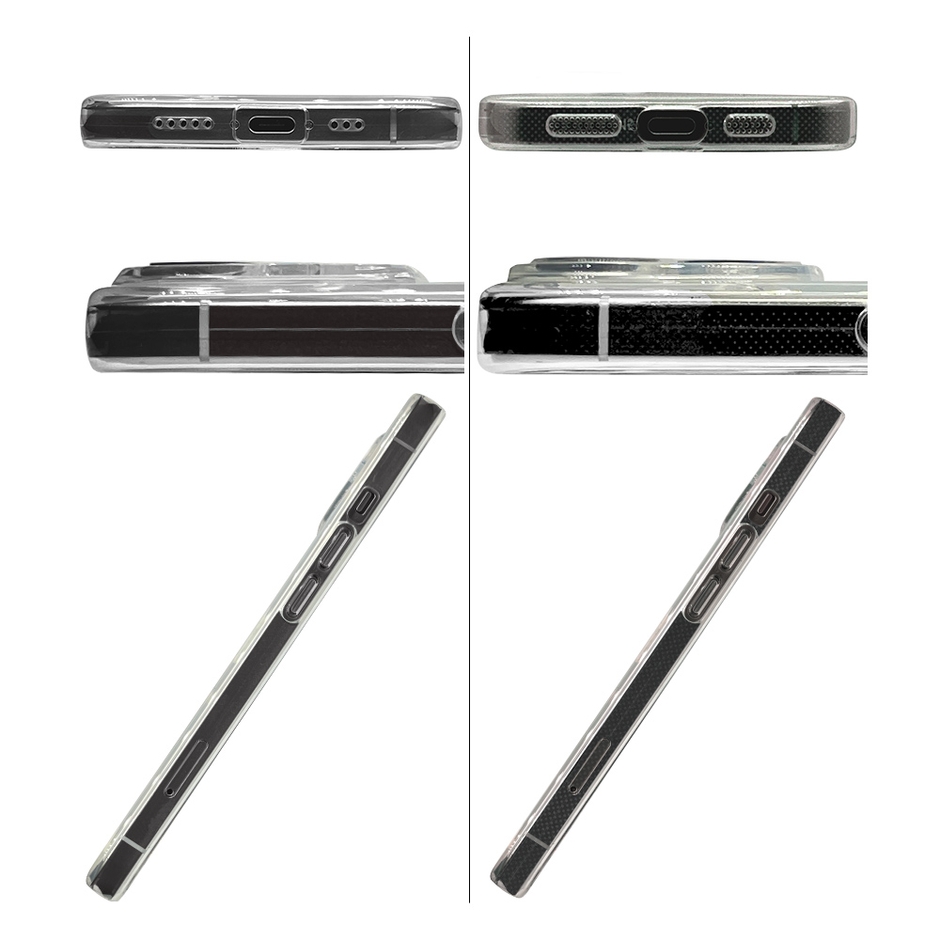一般的なクリアケースは、にじみのような模様が発生するグレア現象を抑えるため、ケースの内側にマイクロドット加工を施していますが、本製品はケース内側のドット加工を行わないことで、従来品と比べて透明度を高めています。