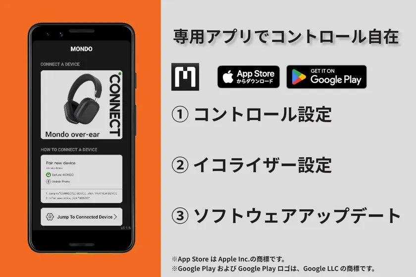 スマホをヘッドホンのリモコン替わりにするほか、EQ設定にも対応しています。