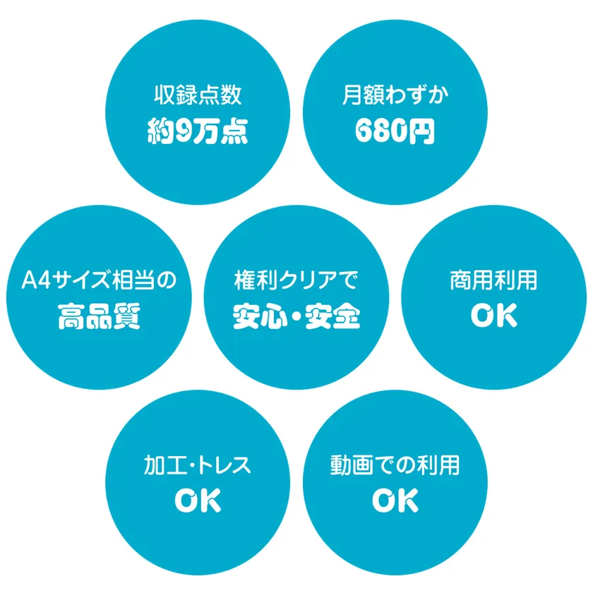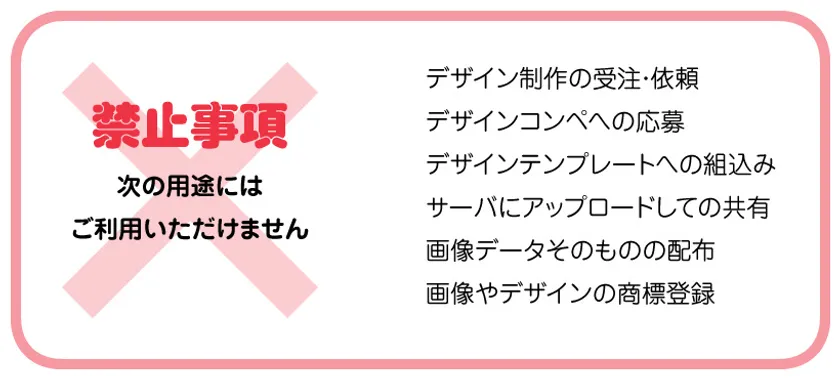 ※クライアントから受注したクリエイティブ制作、デザインコンペへの応募、サーバーへアップロードしての共有、画像データそのものの配布、ソフトウェアやハードウェアへの組み込み、プリントサービス・CMS・ブログ制作サービス等でのデザインテンプレートへの組み込みでのご利用は許諾されておりません。別途エクストラライセンス契約が必要となります。