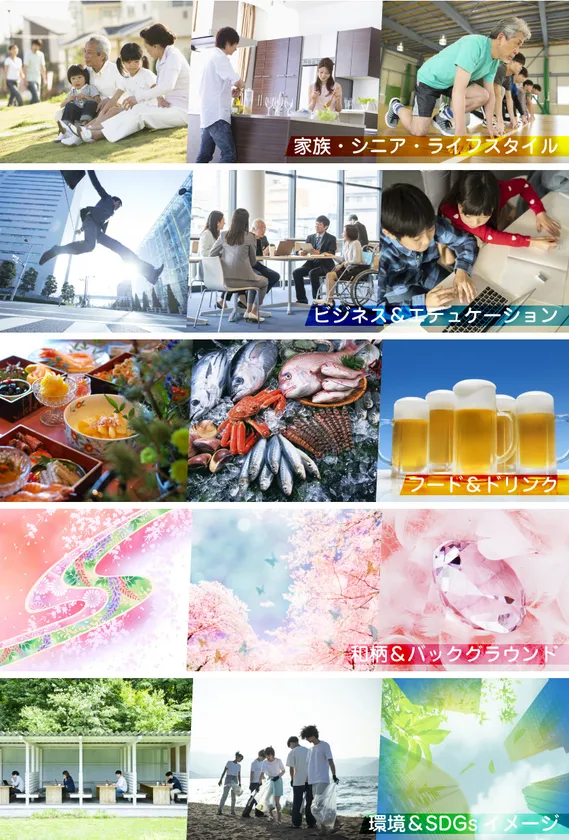 『素材辞典』(そざいじてん)をはじめ、高感度なクリエイティブ画像をそろえた『QxQ IMAGES』(キューバイキュー イメージズ)、現代のセンスで新しい和のイメージを表現した『和の色彩』(わのいろどり)、ごく自然なリアルライフをテーマにした『hana』(ハナ)から、合計約9万点の画像を提供します。