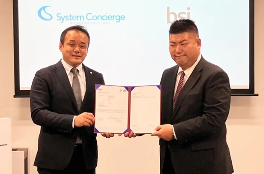 株式会社システムコンシェルジュ 表取締役社長 飯田 健夫(写真右)/BSIグループジャパン株式会社 業本部長 楠本 寛斎(写真左)