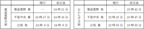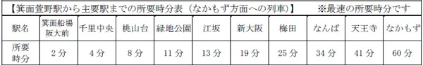 ・北急線内の各駅所要時分およびOsaka Metro御堂筋線の各主要駅までの所要時分は下表のとおりです。