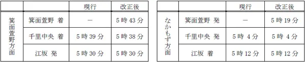 ・なかもず方面への列車は初発のみ千里中央駅始発となります。次発以降は箕面萱野駅始発となります。