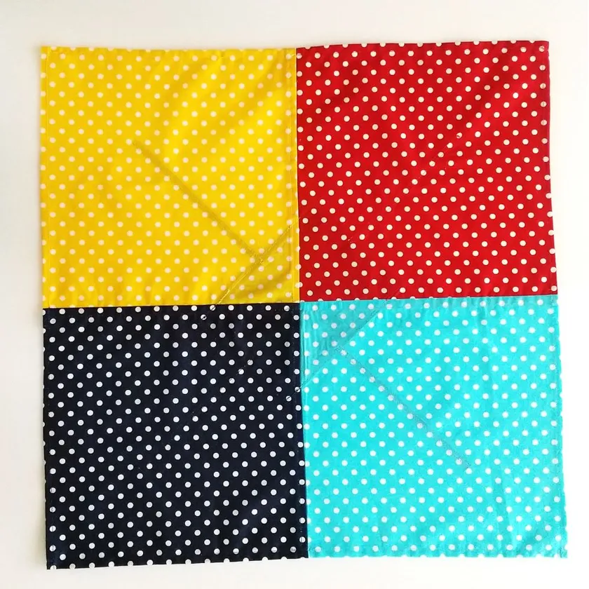 2. 同色の直線で示された1対の対角線の布の両端を合わせる