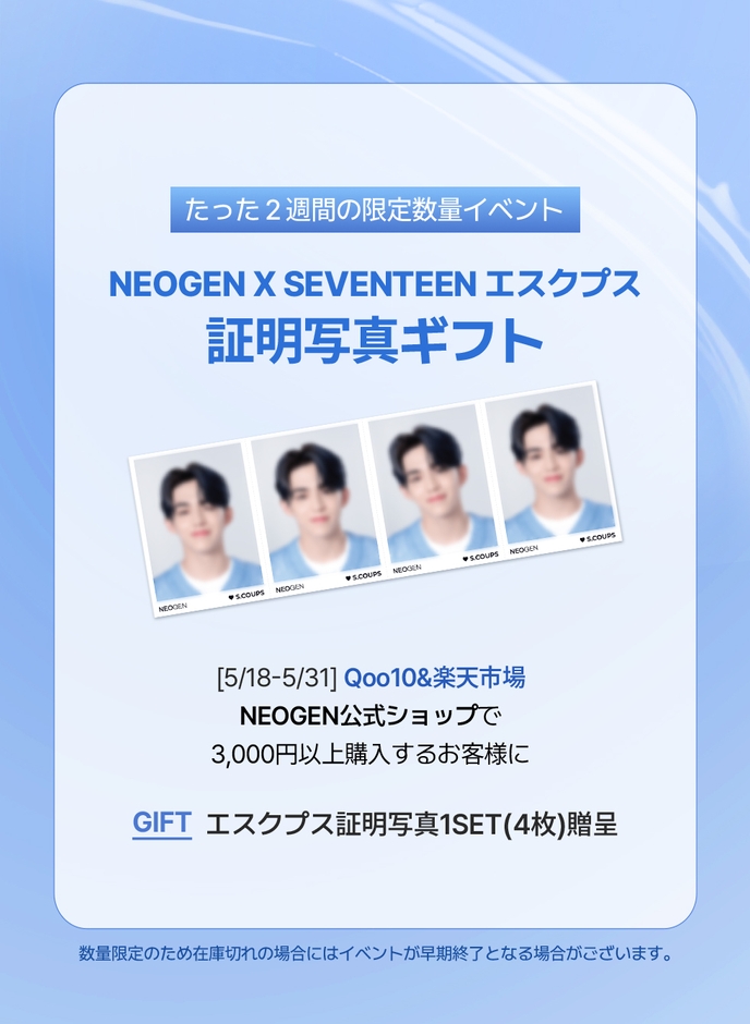 韓国バイオコスメブランド【NEOGEN(ネオゼン)】では、2週間の期間限定でブランドモデルを務めるSEVENTEEN S.COUPSの証明写真が貰えるプレゼントキャンペーンを実施いたします!