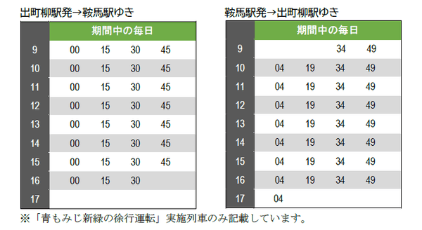 叡山電鉄株式会社(本社:京都市左京区、社長:豊田秀明)では、2023年4月22日(土)~5月31日(水)に市原駅~二ノ瀬駅間の通称「もみじのトンネル」区間で「青もみじ新緑の徐行  運転」を行います。