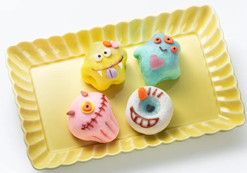 (左上より) 黄:つぶあん入まんじゅう、青:チョコあん入まんじゅう、目玉モンスター:練乳いちごみるくあん入 求肥、ピンク:こしあん入まんじゅう