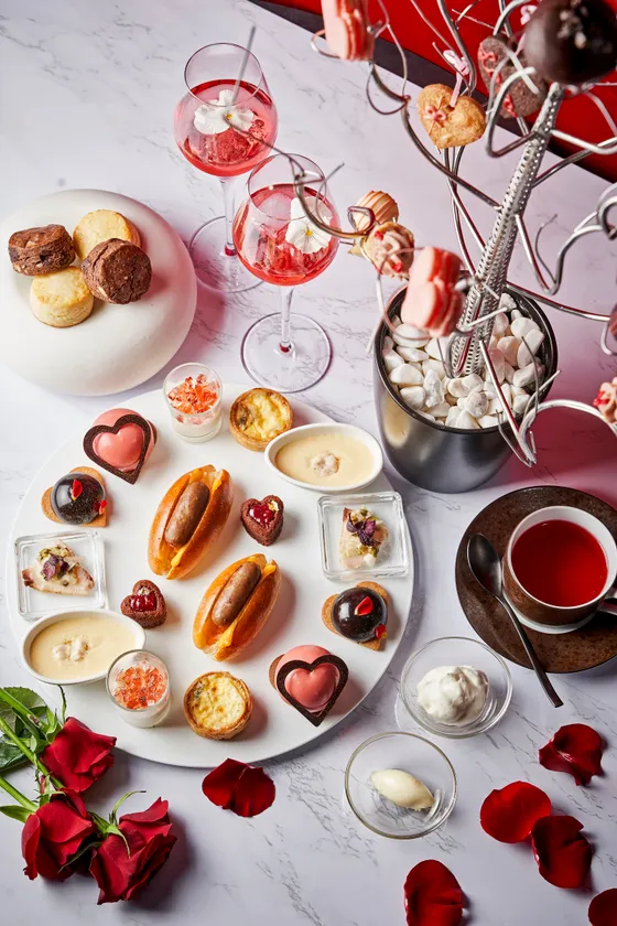 セイヴォリーには旬の食材である「白子のフラン」や「ゆり根と鰻のキッシュ」、自家製ソーセージを使った「ホットドッグ」など、シェフこだわりの味をお楽しみいただけます。スコーンはプレーンとチョコレート&マカデミアナッツの2種類で、シャンティ&クロテッドクリームを添えてご提供します。またウェルカムドリンクには、ローズシロップとクランベリージュースの芳醇な香りが魅力のバレンタインにふさわしい真っ赤なモクテルをご用意しました。ハートやピンクなどバレンタインムード溢れるアフタヌーンティーを、絶景が自慢の落ち着きあるラウンジでご堪能ください。