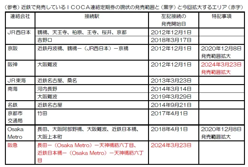 合わせて、阪神電気鉄道株式会社(以下「阪神」)とのICOCA連絡定期券のご利用エリアを拡大します。