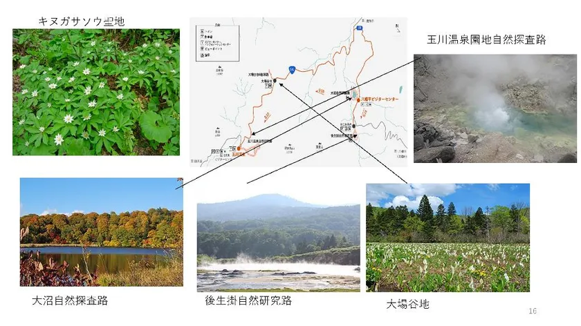 八幡平 :日本最大級の火山高原であり、火山灰や溶岩などの堆積物が分布する。