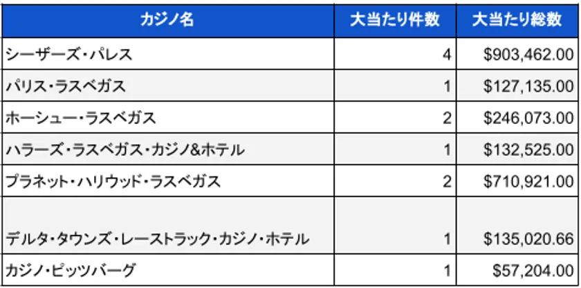 調査期間中の1件あたりの最大ジャックポット当選額はシーザーズ・パレスの40万ドル(日本円で約5千928万円)でした。