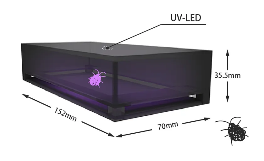 侵入したチャバネゴキブリは、UV光に照射され、徐々に弱り死に至ります。またメスの卵巣や卵鞘にもダメージを与え、産卵、孵化を抑制し、繁殖を防ぎます。