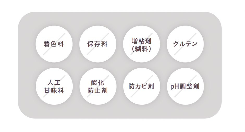 着色料・保存料・増粘剤(糊料)・グルテン・人工甘味料・酸化防止剤・防カビ剤・ph調整剤は不使用。カラダに毎日取り入れるものだからこそ、余計なものは入れないようにこだわりました。