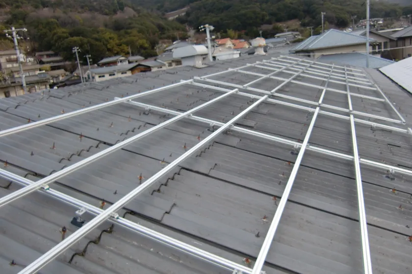 当社では、この課題解決のため、超軽量パネルを使用し、さらに屋根の骨材を利用して強度を高める方法で設置を行うことで、強度の低いスレート屋根にも太陽光発電パネルを設置することを可能にしました。
