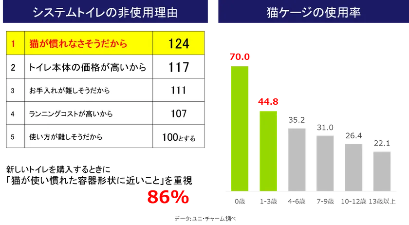 当社の猫用システムトイレ『デオトイレ(R)』は、高い消臭力と、お部屋のインテリアに馴染みやすいデザインや猫ちゃんの体の大きさに合わせられる豊富なサイズバリエーションなどにより、2003年の発売以来、多くの愛猫家にご利用いただいております。一方で、一般的な「猫用排泄トレーに猫砂を敷く」といった対処方法をご利用されている飼い主様は、システムトイレの利便性に関心をお寄せになりながらも、「これまでと形状が異なるトイレに、うちの子が慣れてくれるか心配」という不安をお持ちです。また、最近では様々な理由により、ご自宅内に「ケージ」を設置される飼い主様が増えており、「ケージ内に収まりやすいサイズやデザインが良い」と言った声も増加しています。