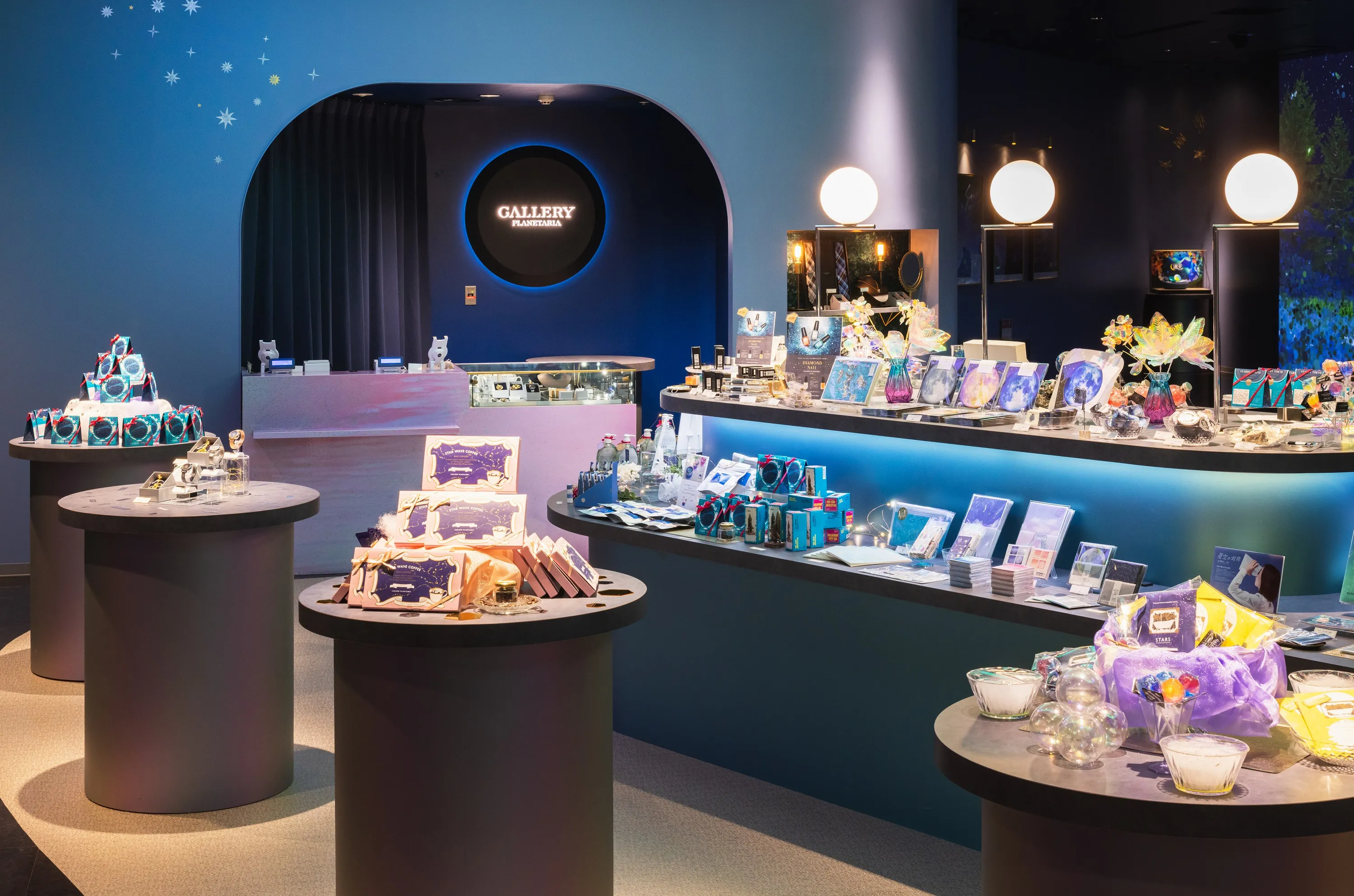 ”天の川の香り”の紅茶や、隕石のキャンドル、星屑のきらめきを詰めたネイルカラーなど、宇宙でここだけの美しいアイテムが並ぶ。