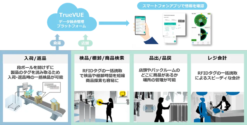 商品入庫時の検品作業は、RFIDシステムを活用することで段ボールの外から電子タグを読み取れるため、一括検品が可能です。店舗での検品や棚卸は、バーコードを一つ一つ読み取る必要がなくなり、作業負担を大幅に軽減できます。また、商品の位置情報も管理できるため、在庫の検索時間が短縮されます。レジ業務では、RFIDタグの一括読取によるスピーディーな会計が可能です。これにより、お客様の待ち時間が短縮され、サービス向上も期待できます。さらに、RFIDの情報はクラウド上のデータ管理プラットフォーム「TrueVUE」に集約され、スマートフォンアプリでリアルタイムに情報を確認できます。