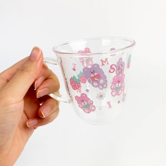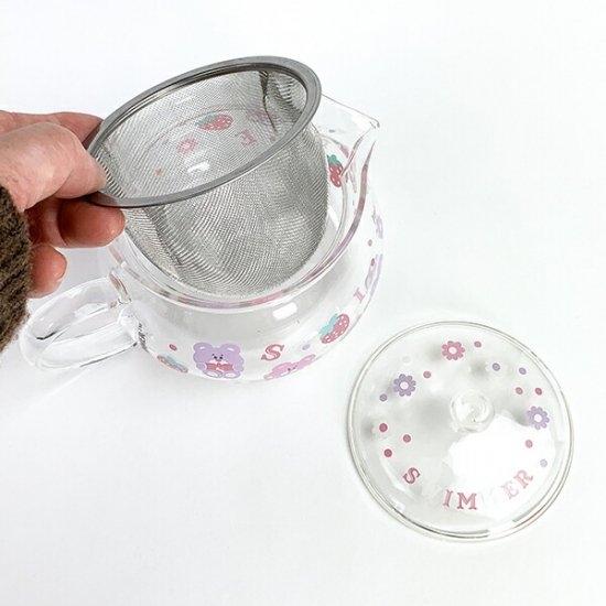 画像のポットは、耐熱ガラスを使用したポットで、ファンシーでゆめかわなイチゴを始め、くまやお花などのモチーフを散りばめました。